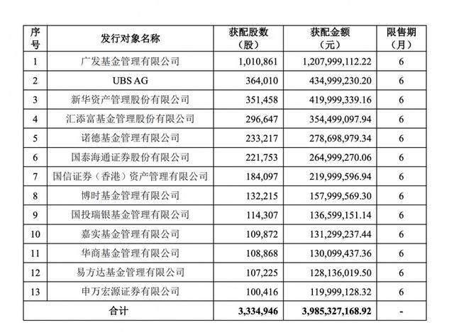 在寒武纪本轮定增中,8家公募合计获配211.32万股,总投入22.66亿元,拿下超五成募资占比。具体来看,广发基金、汇添富、诺德基金、博时基金、国投瑞银、嘉实基金、华商基金、易方达分别投入12.08亿元、3.54亿元、2.79亿元、1.58亿元、1.37亿元、1.31亿元、1.3亿元、1.28亿元,依次获配101.09万股、29.66万股、23.32万股、13.22万股、11.43万股、10.99万股、10.89万股、10.72万股。